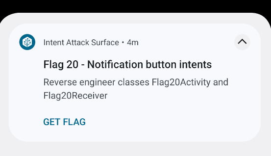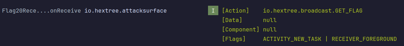 Now we know that it sends an implicit intent to io.hextree.broadcast.GET_FLAG, From the description of the notification we start inspecting both files Flag20Activity & Flag20Receiver, What matters most is Flag20Receiver since the activity isn’t exported: