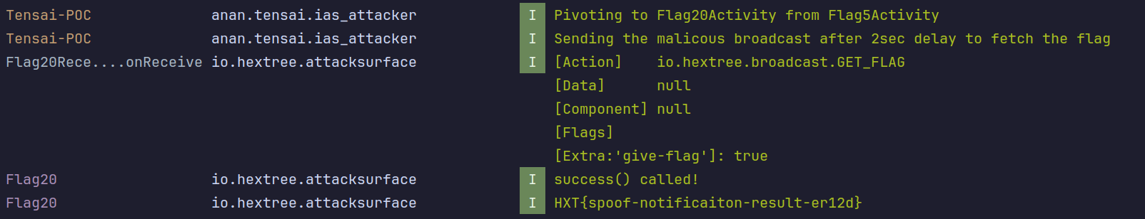 Log.i("Tensai-POC", "Sending the malicous broadcast after 2sec delay to fetch the flag");